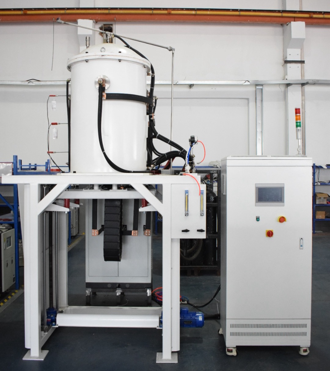 本设备由加热炉、升降机构、水冷系统、气路系统、变压器和电气控制部分组成。加热炉从内到外由加热器、隔热屏和炉腔组成。隔热屏由上隔热屏、下隔热屏和侧面圆筒式隔热屏组成。上隔热屏和侧隔热屏都固定在钟罩内。下隔热屏固定在台面上。